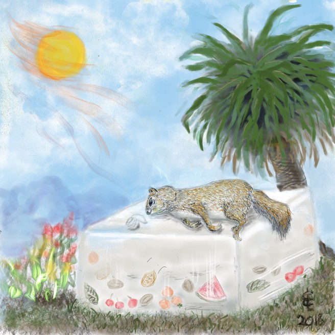 These photos are: Dante helping his mom water a garden recently — we don’t see these blue skies now; Dante with his parents and Grandma Sue on his first birthday; one of my drawings during a previous wildfire — a squirrel getting away from the heat and wildfire smoke while reclining on a large ice block that contains bits of fruit for later consumption — and a mask beside him; the first maypop (passion flower) to bloom this season on a vine given to us by neighbor; and Dante with sunflowers and his dog, having his birthday photo taken by Mom.